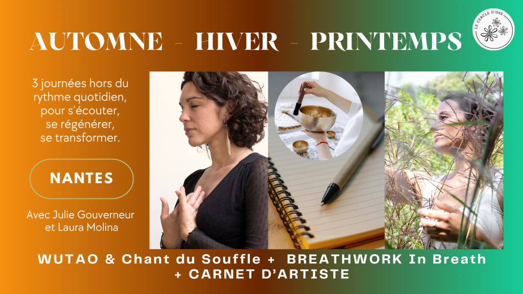 Trois journées pour revenir à soi, pour plonger dans le corps et dans le souffle, pour réveiller la créativité qui habite chacun.e de nous. Pratiques du Wutao, du Breathwork In Breath et exploration créative à travers un carnet d’artiste, ces journées sont des espaces-temps hors du rythme quotidien, pour s’écouter, se régénérer, se transformer.